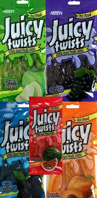 First impression: these things are sweaty. Yes, they’re made with fruit juice, so….wait. Hold on-aren’t a LOT of candies made with real fruit juice? Yes. And are they all sweaty? No. Ok, so..then what’s the reason for the perspiring fruit twists? It’s kind of fucking gross to pull a twist out of the bag, only to get a smooth sheen of…goop all over you. Isn’t it? Me no likee.